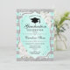 Convite para festa de formatura. Apresenta faixas, fontes de script, rosas brancas, tassel e confetti. Elegante verde-menta, design de turquesa com prata brilhante. Perfeito para uma elegante celebração chique de blam.