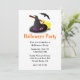 Um convite à festa do Dia das Bruxas, com gráficos simples de um chapéu de bruxa, vassoura e um morcego, no topo do convite branco. Personalize todo o texto para a sua cesta de Halloween. Adequado para festas de adultos e crianças.