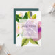 Um convite elegante e moderno para a festa de noivado floral apresenta um buquê de flores cor-de-água roxas e cor-de-rosa vibrantes, realçadas com botões e verde-luxuoso. Os detalhes da sua festa de noivado estão sobrepostos em um elemento branco puro em letras escura escura e elegante acentuadas com caligrafia de estilo manuscrito.