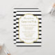 Convites de festa de noivado personalizados em um padrão clássico de faixas preto e branco com borda dourada e texto de estilo manuscrito. Totalmente personalizável com seus detalhes de festa de noivado. Também disponível em uma grande variedade de produtos de casamento correspondentes.