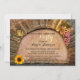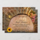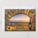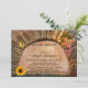 Um convite à festa de solteira romântico que inclui um arco romano com uvas, copos de vinho e garrafa, lanterna e girassol. A frente do convite tem um fundo artístico para o seu texto e atrás você pode encontrar uma pintura de vinhedo no pôr do sol.