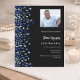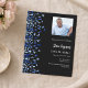 Um moderno, elegante e convite. Um fundo preto decorado com confete azul. Personalize e adicione fotos, um nome e detalhes da festa. Texto branco. 1 folha = 1 convite impresso de borda a borda.