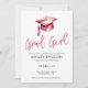 Cartão modelo de convite para festa de formatura de moderno com tipografia de script que diz "Rapariga Formando" em escrevendo rosa. Um desenho de aquarela de um chapéu de graduação rosa. Opção para adicionar uma foto à parte traseira do cartão de graduação.