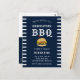 Anuncie sua formatura e convide seus hóspedes em estilo com este convite de festas de Formando de cartão-postal temido para este CHURRASCO. Esta design moderna apresenta uma tipografia branca a preto, realçada por uma ilustração de um hambúrguer de queijo com as obras. Nos lados há uma borda listrada azul e branca. A parte de trás do cartão tem os detalhes da sua graduação acentuados por um boné de formatura branco. Parabéns pela sua formatura! Desenhada pela artista Susan Coffey.