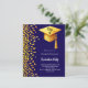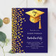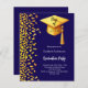 Um convite moderno e elegante para a Festa de formatura. Um fundo azul escuro decorado com confete dourado falso e um boné de formatura grande com tassel. Personalize e adicione um nome e detalhes da parte. Texto branco. 1 folha = 1 convite impresso de borda a borda.