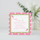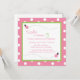 Fundo de bolinhas rosa e branco, adorável, com um quadro verde e um convite de aniversário de uma bela joaninha.
