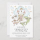 Um reino mágico do castelo aquoso com princesa e dragão, convite de festas de primeiro aniversario de menina com uma fronteira branca. Whimsical, mágico e fofo, para uma criança.