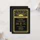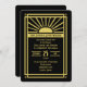 Este convite de recepção de casamento de posto de arte aparece em preto e ouro. Uma explosão de sol é o ponto focal do convite com toques de arte deco por todo o lado. Este convite tem uma sensação retrógrada de excelente e é uma maneira maravilhosa de convidar seus convidados para sua recepção de casamento de posto com um tema de casamento ruinoso dos anos 20. Direitos autorais