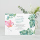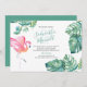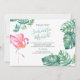 Diga à Floresta tropical de A Belle e ao convite para janto de recepção de flamingo cor-de-rosa que o design complementa os seus detalhes de evento com uma cor d'água pincelada verde-folha de palma de monstera. Uma escolha botânica e sofisticada para seu janto de recepção de tiki no quintal na Flórida, Flórida Keys ou Key West, por Designs Victoria Rigali. Para ver mais convites para casamento na Flórida visite www.zazzle.com/dotellabelle