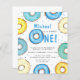 Está planejando a primeira festa de aniversário de um menino? Este belo convite de aniversário de orçamento é decorado com rosquinhas de aquarela em tons pastéis de azul e amarelo. Facilmente personalizável. Original Watercolor © Michele Davies.