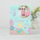 Pequena carta de convite para o terceiro aniversário da sereia com criaturas submarinas e modelo de inserção de fotos.