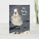 Convite para uma festa com uma gaivota vestida de flores laranja em volta do pescoço e na cabeça para que pareça estar pronta para a festa.