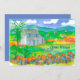 Um bonito cartão de convite à Open House para a temporada de outono, com uma cabana silenciosa em colinas verdes, com folhas em constante mutação, e uma fileira de abóboras sobre uma parede de rocha pintada com tons brilhantes de aquarela.