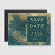 Este elegante casamento Salve o cartão da data apresenta um fundo azul-lacado moderno e abstrato de cor d'água dourada. Personalize o texto dourado em fontes na moda em um retângulo verde escuro.