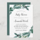 Os convites de chuvas botânicos para bebês elegantes apresentam uma paleta colorida de chic verde-floresta, preto-branco-escuro e branco-nítido. Os detalhes do seu chá de fraldas estão cheios de galhos verdes abundantes e folhas num estilo de aquarela pintada vibrantemente.