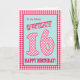 Um 16o cartão de aniversário doce para um amigo, com uma sensação bonito, retro. As letras, os números e a beira estão no guingão e em bolinhas vermelhos e brancos da verificação em um fundo dos azul-céu. Você pode mudar a mensagem interna se você deseja.