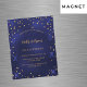 Um convite de aniversário magnético para ele e para ela. Um fundo azul marinho decorado com estrelas douradas falsas. A cor azul é irregular. Personalize e adicione um nome e detalhes da parte. Adicionar ano de nascimento e ano de celebração