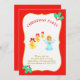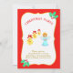 Convite anjo da festa de Natal. Um pequeno anjo vestido de azul claro com bolas de Natal ouro sobre fundo branco e vermelho.