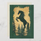Convite elegante Ano do Cavalo 2026 apresentando uma majestosa silhueta de cavalo em pé sobre árvores de pinheiro verde floresta profunda em dourado brilhante.
