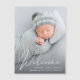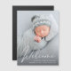 Um ímã de anúncio de nascimento com a foto de seu recém-nascido, sobrecarregado com "Bem-vindo" em um roteiro branco de na moda. Adicione o nome do seu bebê, data de nascimento e estatísticas de nascimento.