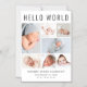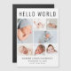 Um ímã de anúncio de nascimento de manutenção de chic para apresentar seu bebê recém-nascido a amigos e familiares com "Hello World" em letras grandes, uma colagem de sete fotos e seu nome, data de nascimento e estatísticas de natalidade em uma simples tipografia moderna.