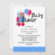 O convite para o chá de fraldas de um menino colorido, com gráficos bonitos de um trem de choo vermelho, azul, verde e amarelo, com balões de bolinhas, e uma banda de sotaque de bolinhas azul e branca, na parte inferior. O texto gráfico lê Chá de fraldas, no topo. Personalize o texto preto personalizado para atender às necessidades do seu chá. Os produtos correspondentes estão disponíveis.