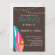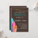 Convite perfeito quando o sexo do novo bebê é desconhecido. Convite BabyQ com pranchas coloridas e pequenas luzes amarradas sobre fundo castanho escuro.