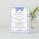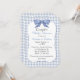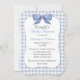 Convite para chá de fraldas em forma de casal de Na moda feito em um padrão verificado de gingham azul e branco. Os gráficos de uma área de texto branco azul esboçada, no meio, têm um arco azul bonito, no topo. A parte de trás é feita no mesmo padrão de gingham. Personalize todo o texto para atender às suas necessidades de evento.