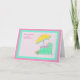 Convite para Chá de fraldas, desenho de bebê na basinette com um guarda-chuva amarelo. O cartão é, na sua maioria, cor-de-rosa e verde.