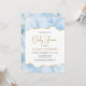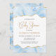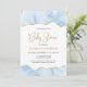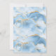Este convite de chá de fraldas de tendência apresenta uma borda superior e inferior do geode de agate de cor d'água em tons de azul bebê com realces de brilho dourado falsos. As palavras "Chá de fraldas" aparecem na falsa brilha dourada em letra decorativa moderna de escrita manual. Personalize-o com o nome da futura mãe em texto dourado e os detalhes da festa em cinzas de carvão em fundo branco. Uma imagem de azul pastel correspondente e de agate dourado aparece no lado oposto.