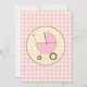 Um convite com um fundo de gingham rosa sobre bege quente com trim marrom. Personalize o texto da fonte marrom com detalhes do evento. O lado oposto é gingham sólido com uma carruagem de bebê cor-de-rosa com uma estrutura em forma de círculo correspondente.