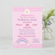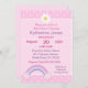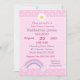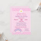 Convite para Chá de fraldas Arco-Íris com uma flor branca e fundo rosa. Personalize os convites para chuveiros de bebês com os detalhes da sua festa.