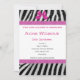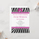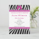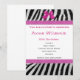 Este convite divertido apresenta impressões zebra em preto e branco no topo e na parte inferior. Um gráfico de uma fita cor-de-rosa corre ao longo da impressão zebra. Um arco cor-de-rosa trava do topo.