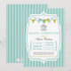 Este bebé que 5x7 o chá convida tem um fundo das listras da cerceta do azul e da luz. No primeiro plano, há um quadro branco à moda com uma beira azul. Na parte superior, há duas bandeiras bunting que são azuis e marrons drapejadas de cada lado do quadro. Pendurar do meio é uma gaiola de pássaro marrom com uma silhueta azul do pássaro que senta-se para dentro. Abaixo, o chá de fraldas é escrito em uma pia batismal à moda azul. O resto da informação é redigido em um estilo do faturamento do vintage que você pode facilmente personalizar com sua própria informação.