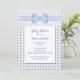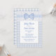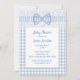 Chá de fraldas chique do país doce, feito em um teste padrão checkered azul e branco da luz - do guingão, com uma área de texto branca, na parte dianteira. Gráficos do estiramento azul e branco do laço branco e de uma luz - do guingão da fita e do arco através da parte superior. Personalize o texto azul para seu dia especial.