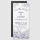 Convites de casamento brancos azuis para qualquer época do ano. Seus detalhes são acentuados pelas fronteiras de cima e de baixo da linha desenhada Dianthus, Lily do Vale, folhagem e Lady Bugs.