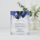Um convite de festa de aniversário feminino e delicado. Na frente: Um fundo prateado falso. Decorado com gotas de brilho azul-marinho falsas, efeito de tinta pingando e balões. Personalize e adicione um nome e detalhes da festa. O nome é escrito com uma fonte de letra manuscrita.
