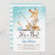 É um menino! Bonito convite de chá de fraldas azul de coelho da floresta. Fundo de aquarela e striped para trás.