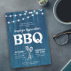 Este convite para CHURRASCO de Apreciação de Funcionário apresenta um fundo azul-rústico acentuado com cordas de luzes externas. Personalize este simples convite temático de verão com todos os detalhes do evento.