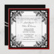 Convite formal elegante do casamento feito em preto, em branco, e o vermelho. Gráficos elegantes de um quadro barroco preto do estilo contra um fundo branco e uma borda exterior vermelho escuro. Um verso preto contínuo do cartão, com gráficos de uma costa de pérolas dobro, através do meio. O texto no preto é inteiramente customizável serir suas necessidades do casamento.