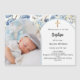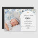 Adicione sua própria foto de tamanho vertical. Um pequeno arco azul colorido em forma de fotograma. Uma cor de fundo branca, decorada com forais azuis, flores. Personalize e adicione um nome e detalhes.