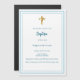 Um fundo branco, decorado com um quadro azul claro, e um ouro cruza Personalize e adicione o nome e os detalhes. Texto branco.
