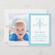 Este convite do Batismo, Natal moderno, apresenta uma cruz azul e verde com estilo aquarela e área fotográfica. Pode ser personalizado para a ocasião cristã especial do seu filho.