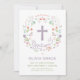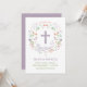 Este elegante e bonito batismo, batizante convite apresenta uma coroa floral ilustrada com a palavra "batismo" em torno de uma cruz. A cor do texto, a fonte e a mensagem podem ser alteradas para seu gosto. A parte de trás do convite apresenta um fundo roxo (que pode ser trocado para qualquer cor da sua escolha) com um padrão quatrefoil branco.