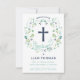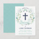 Este elegante e bonito batismo, batizante convite, apresenta uma coroa floral ilustrada com a palavra "batismo" a rodear uma cruz. A cor do texto, a fonte e a mensagem podem ser alteradas para seu gosto. A parte traseira do convite contém um plano de fundo azul/verde (que pode ser trocado para qualquer cor de sua escolha) com um padrão quatrefoil branco.
