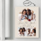 Essa simples e minimalista placa Save the Date apresenta uma colagem de 3 fotos, com uma foto em forma de arco na parte superior e duas fotos quadradas menores na parte inferior. No meio, as palavras "Salvar a Data" aparecem no elegante guião preto, seguido dos nomes dos casais, da data do casamento e da cidade em sans serif em um fundo bege.