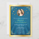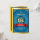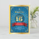 Um doce convite de festas de dezesseis anos que lembra um concerto ou um poster de circo. Um medalhão encerra a ouro de palavras "Sweet 16", sobre um fundo azul de rajada profundo enquadrado contra ouro. O nome da aniversariante se destaca em uma faixa vermelha brilhante. Adicione informações sobre o reverso, juntamente com uma foto no lugar do grande tipo 16 doce. Disponível com produtos correspondentes.