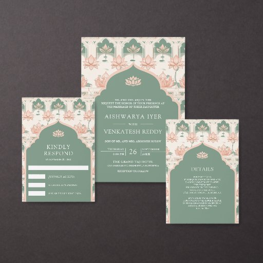 Convite Blush Pink Pastel Green Lotus Pond Indian Wedding