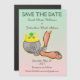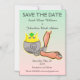Bola e Cadeia Personalizáveis Salve a Data. Um design para um casal amoroso e divertido. Uma perna de homem trancada com uma bola e uma corrente. A bola está vestindo uma tiara ouro com uma esmeralda verde enorme. O plano de fundo é um gradiente rosa-tendência. Você pode personalizar isso com seus próprios detalhes de celebração de casamento.