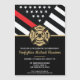 Este design apresenta uma bandeira de bombeiros com listras pretas e brancas, e uma fina faixa vermelha também. Um crachá de bombeiro está sentado acima de todos os detalhes da festa para o bombeiro graduado. Esta design também trabalha excelente para um bombeiro aposentado, tenente, ou festa de aposentadoria do chefe.